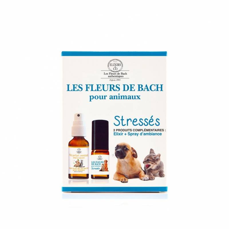 Le programme animaux stressés propose deux produits associés pour une efficacité optimale. L’élixir animaux stressés aide à calmer et réduire les peurs et phobies de l’animal. Le spray d’ambiance réconfort immédiat calme immédiatement et convient à tous les animaux sans risque ni effet secondaire.